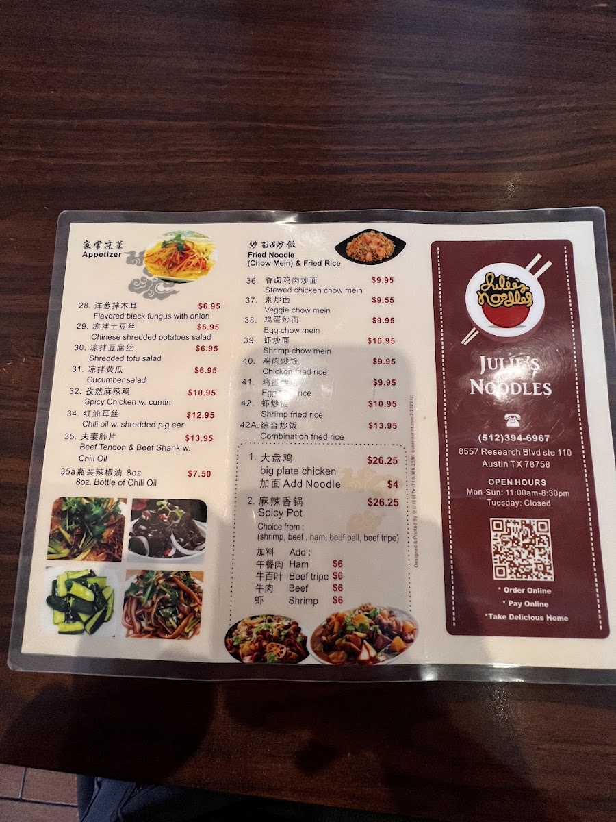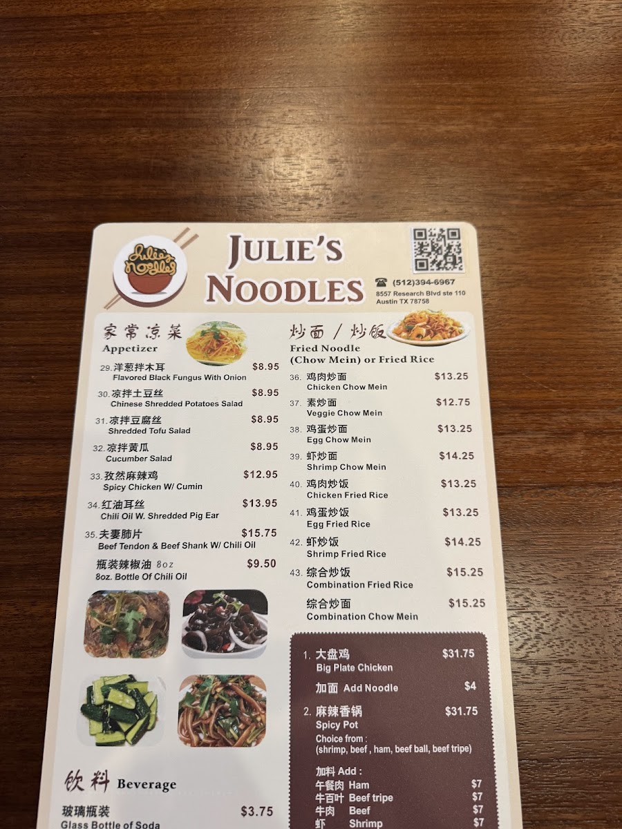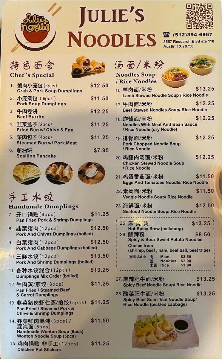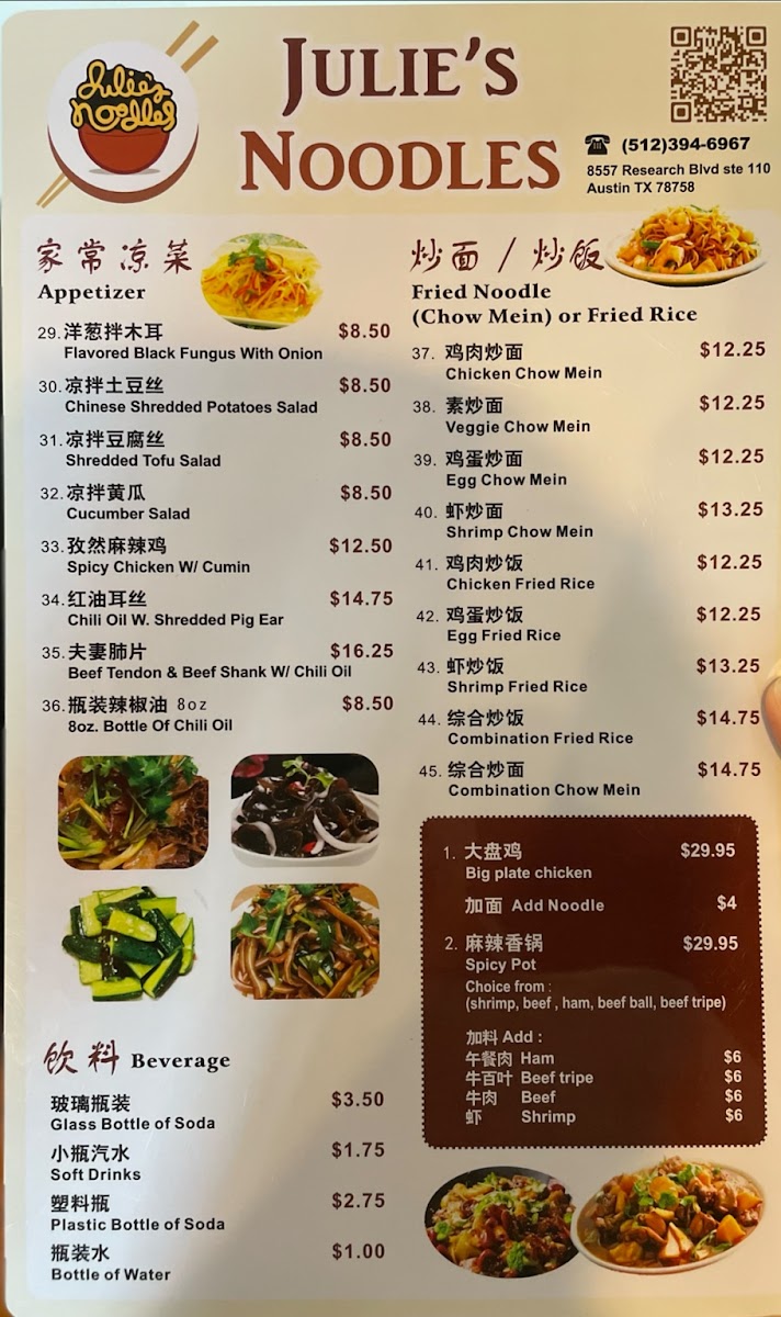 Welcome to Julie's Noodles, a hidden gem located at 8557 Research Blvd #110, Austin, TX 78758, that promises an authentic taste of Chinese cuisine bursting with flavor and character. As you step through the doors, you are instantly enveloped in a warm and inviting atmosphere — the aroma of perfectly seasoned dishes wafts through the air, enticing your senses and whetting your appetite.